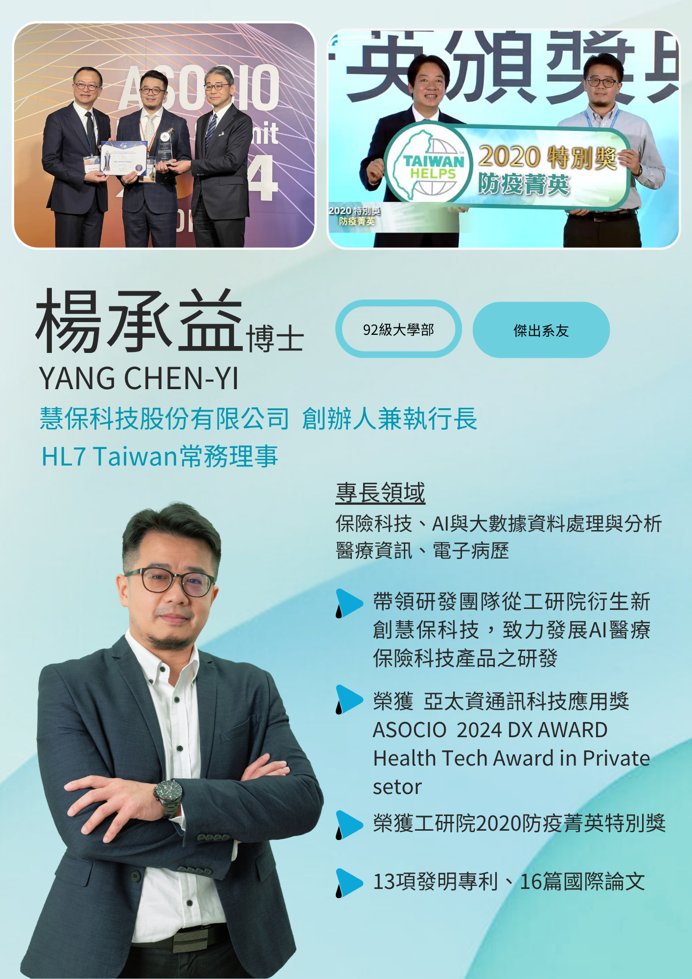 楊承益 | 致力發展AI醫療保險科技產品之研發,並榮獲亞太資訊通訊科技應用獎、2020工研院防疫菁英特別獎 | >MORE |